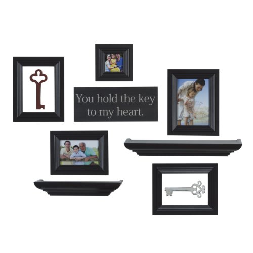 -. Feature : The set includes 1 5x7-inch frame, 1 6x4-inch frame, 1 3x3-inch frame, and 2 5x7-inch backless frames, as well as 1 12-inch shelf, 1 16-inch shelf, 2 key decor pieces and 1 sentiment plaque / All pieces are made of medium-density fiberboard (MDF) with an espresso finish / The frames hold 1 5x7-inch, 1 6x4-inch and 1 3x3-inch photo / The photo frames and ledge shelves are accompanied by 2 framed keys and a plaque with the sentiment "You hold the key to my heart" / Group the pieces together or hang them separately