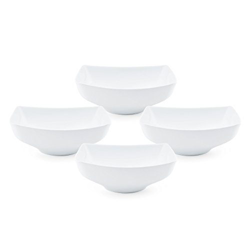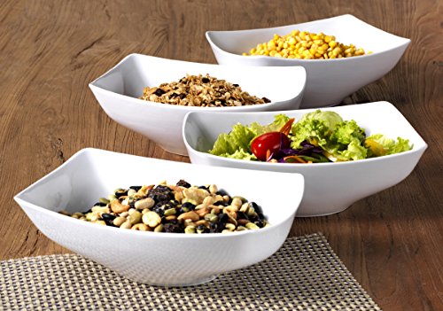 This set of 4 White Rectangular Side Bowls from Gourmet Basics by Mikasa is the ultimate in modern dinnerware design and sets a tone of elegant sophistication at all your dinner gatherings. These rectangular bowls are made of pure white porcelain with high curved sides that cradle vegetables, potatoes and other side dishes, making for an incredibly appetizing presentation on your table. Each bowl measures 9-1/4 Inch long x 7 Inch wide x 3-3/4 Inch high. Set of 4. Microwave and dishwasher safe.Feature