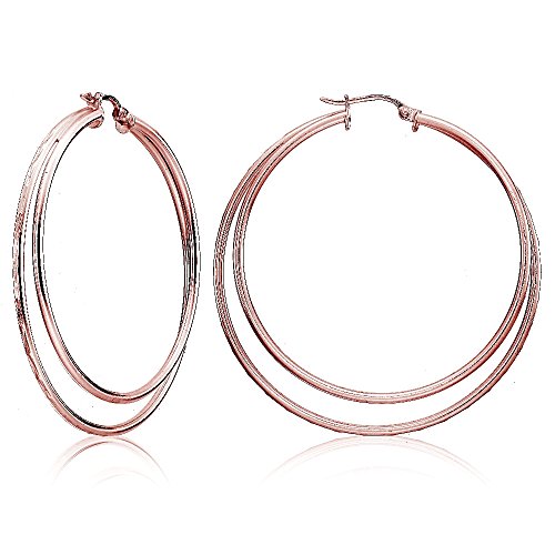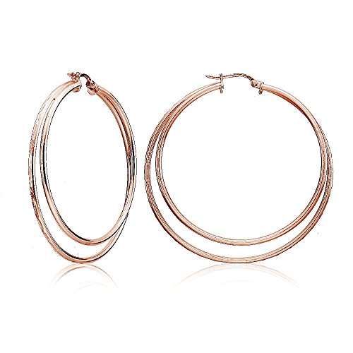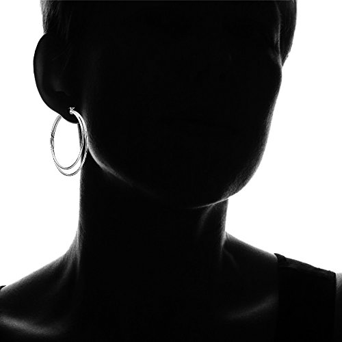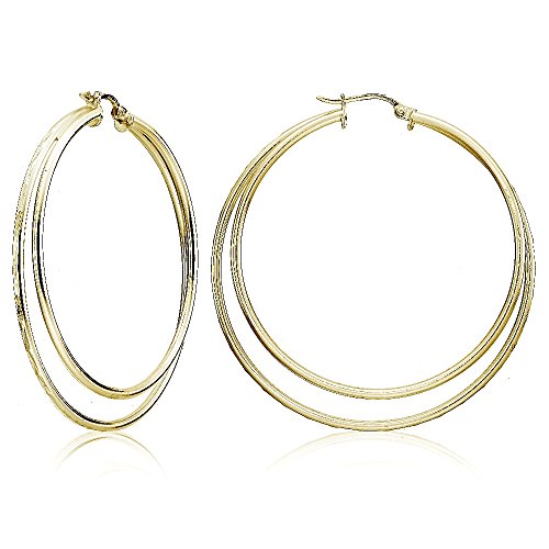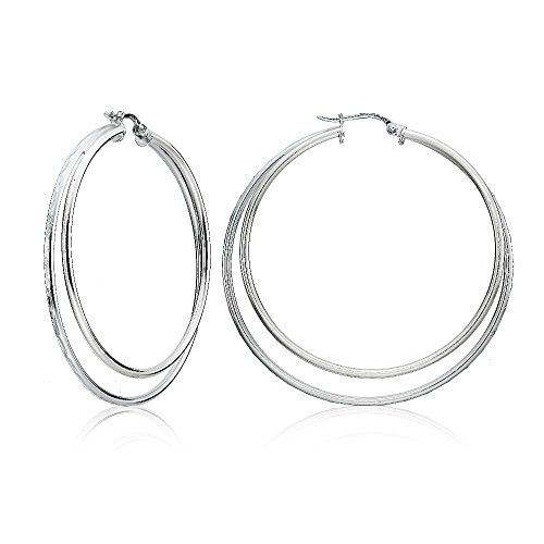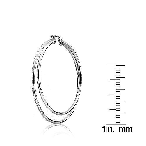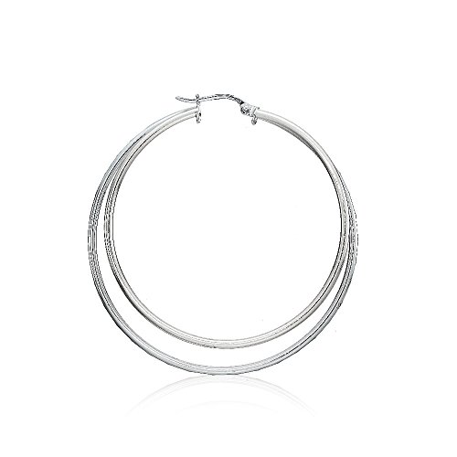 These earrings feature a pair of diamond cut square-tube high polished hoops with a double circle design in sterling silver. They are 45mm in diameter.