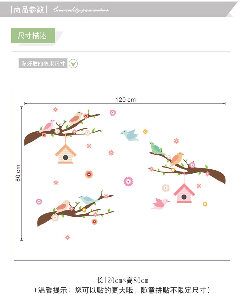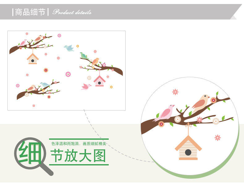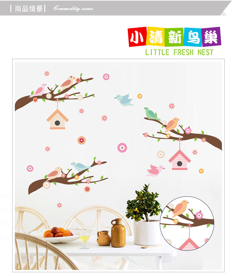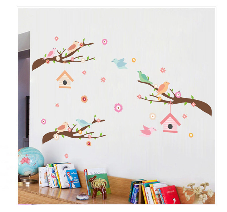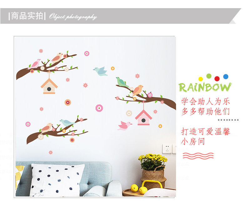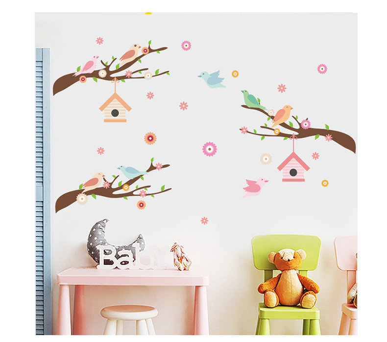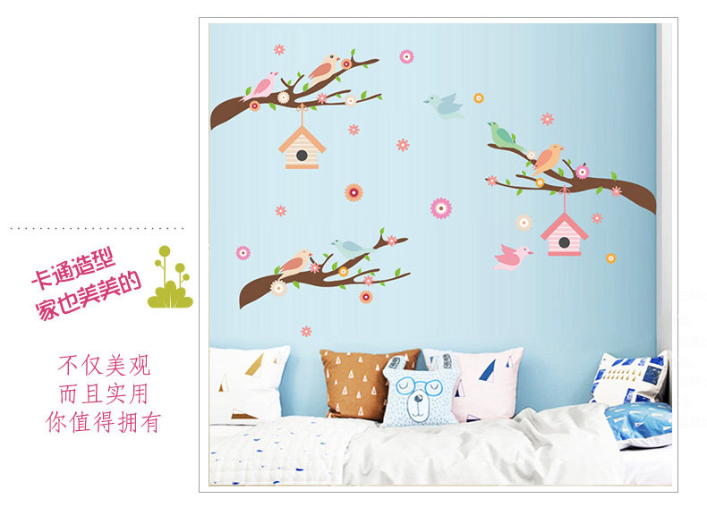 可爱卡通小鸟房子树枝彩色墙贴儿童房间幼儿园墙面贴纸墙贴自粘