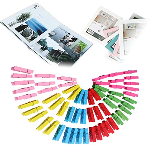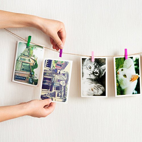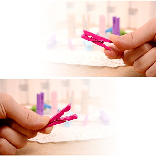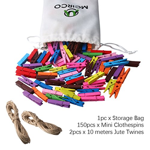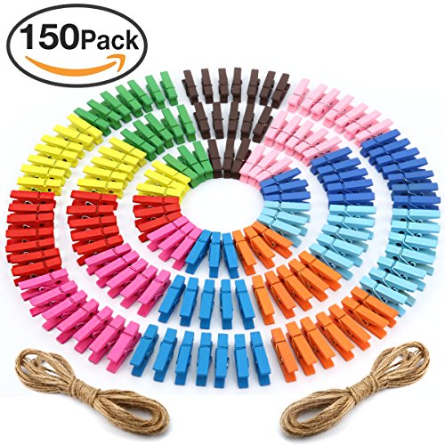MCIRCO 150 Pcs Mini Colored Natural Wooden Clothespins Photo Paper Peg Pin Craft Clips with Jute Twine