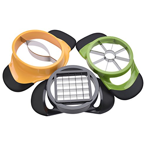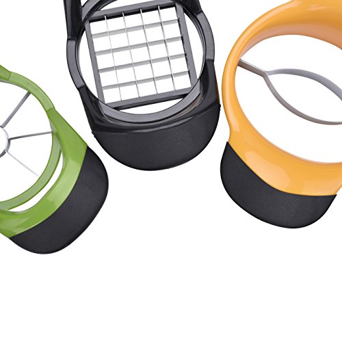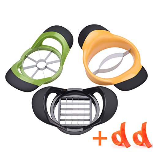 -. Feature : 5 PCS Kitchen Vegetable Fruit Slicer Corer Cutter Set: apple/fruits corer slicer + French fries cutter + mango corer + 2 PCS free orange peelers as bonus. Single one of them sells for $9.99~$12.99 on the market, but now you can get all of them for an unbeatable price. Limited time, don't hesitate to save money NOW! / Stylish Design Multipurpose Kitchen Slicer Set: 100% stainless steel blades with BPA free anti-slip silicone handle for comfortable grip, ergonomic design and cute color makes it a shinning star in your kitchen. / Premium Quality & Ultra Durable Vegetable Fruit Slicer: Extra 1mm thick food grade stainless steel blades guarantee long-term usage that will last years, 100% rust & corrosion resistant. Heavy duty design, sturdy construction ensures long-time usage that will last years. / Easy To Use & Easy To Clean Fruit Vegetable Tools: Multifunction/multipurpose use, super sharp blades cut the fruits or vegetables with ease, save your time in the kitchen. Dishwasher safe, just rinse the slicer/corer/divider/cutter in warm soapy water or place it in the dishwasher after use. / ★1. APPLE SLICER: Slice fruits into 8 perfect slices, simultaneously remove the core, suitable for most medium-sized round fruits; ★2. FRENCH FRIES CUTTER / STRIPS OR CUBES CUTTER: Ideal for making French fries and cutting fruits or vegetables such as mango, apple, pear, guajava, carrot, zucchini, beet, mooli into cubes or strips; ★3. MANGO CUTTER CORER: Slice mango into 2 pieces, simultaneously remove the core with ease; ★4. ORANGE PEELER: Peel orange, lemon and other citrus fruits.