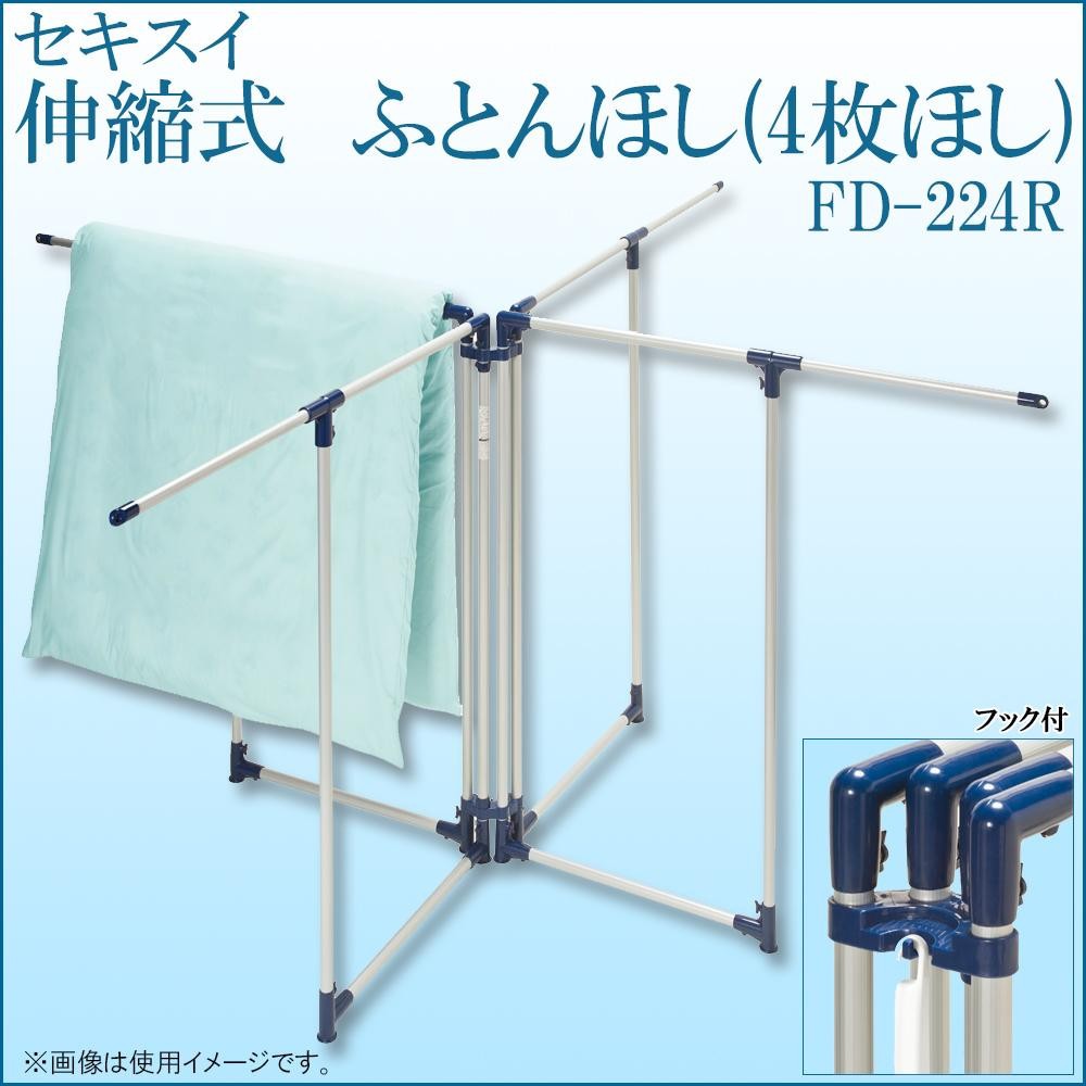 | 干し部は伸縮式で長さ調節ができ、横通しで簡単にふとんが干せます。4つの枠体結束でネジレに強い特殊構造!!ふとん叩きなどが掛けられるフック付きです。 |
