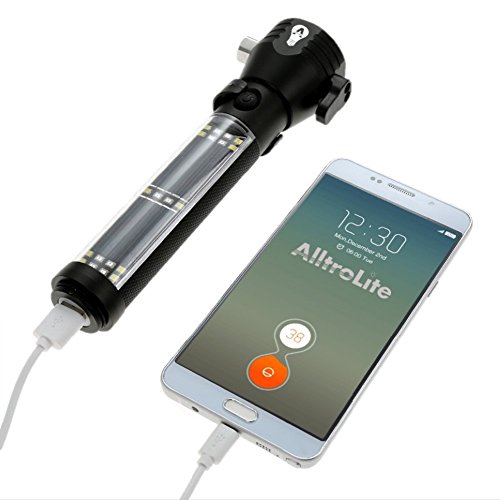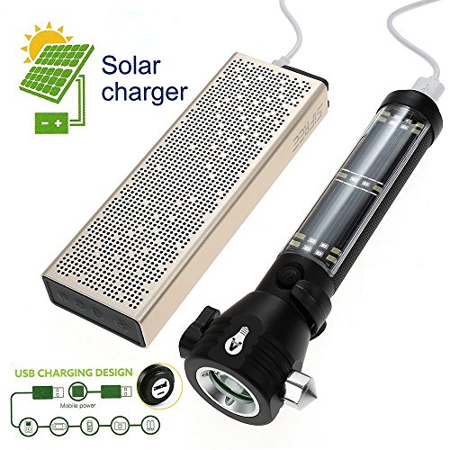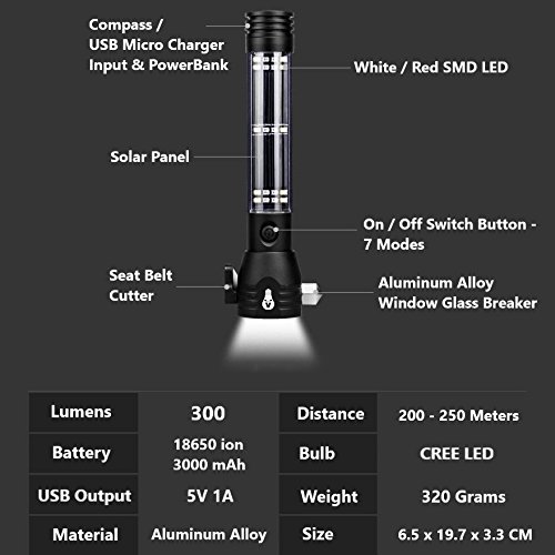 Lifesaver 2 Emergency Car Flashlight - Solar Flashlights USB Torch Multi-functional LED Light with Car Emergency Tool, Attack Hammer, Cutting Knife, Compass Etc. for Camping, Travel, Hiking Safety