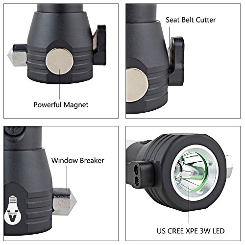 - ☀【Multi-Function Emergency Tool】 With the seat belt cutter and glass window breaker, it will be helpful to cut the rope, break the glass in emergency.With a powerful magnet on the side of the flashlight head, you could attach it to the metallic surface to use as a work light, camping lamp or emergency warning light.And the compass of the tail help you find the direction.