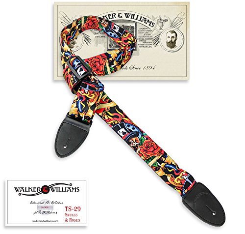 -. Brand : Walker & Williams -. Color : red, black, gold -. EAN : 0736024416403 -. Feature : US Quality Handmade Strap For Electric or Acoustic Guitar or Bass / Vivid Sublimation Printed Top With Top Hat Skulls & Roses / 2" Wide Fine Weave Soft Feel Poly Material / Real Leather Reinforced End Caps / Extra Short to Extra Long-Adjustable From 34"-59" -. Label : Walker & Williams -. Manufacturer : Walker & Williams -. Model : TS-29 -. MPN : WW-TS-29 -. PackageQuantity : 1 -. PartNumber : WW-TS-29 -. ProductGroup : Musical Instruments -. ProductTypeName : INSTRUMENT_PARTS_AND_ACCESSORIES -. Publisher : Walker & Williams -. Studio : Walker & Williams -. Title : Walker & Williams TS-29 Top Hat Skulls & Roses Guitar Strap -. UPC : 736024416403
