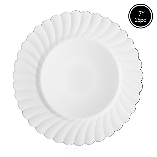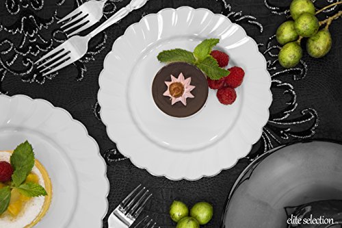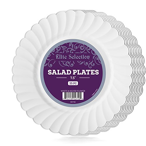 Elite Selection Pack Of 25 White Salad / Dessert Disposable Party Plastic Plates With Silver Flower Rim 7.5-Inch