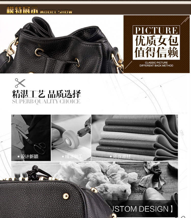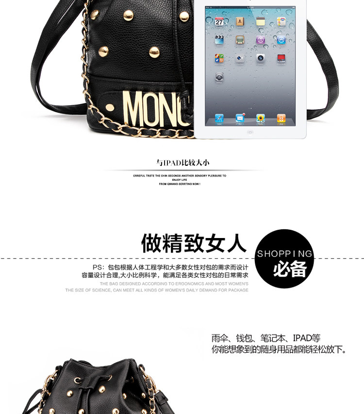 韩版双肩铆钉水桶包女包2016新款抽带女士包包潮手提包单肩斜挎包