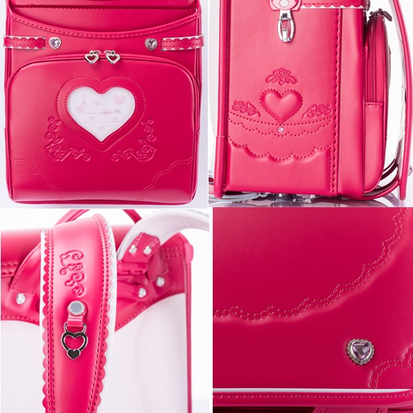 内装:ピンクハート、錠前:ワンタッチロック、補強:ガッチリガード、ポケット:ワイドポケット・Dカン付、肩ベルト:ふわりぃ仕様・長尺・9穴・フリル型・型押し・右(ハートカン)・左(小ナスカン)、鋲:ハート、ナスカン:反射材付、冠裏:ピックハート、反射材:冠下部・前締め・肩ベルト、固定型持ち手、カラー:ビビットピンク×ビビットピンク