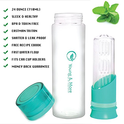 **BEWARE OF COUNTERFEITERS. Genuine Young & More brand products are fulfilled by Amazon & only from Amazon.com** It's a known fact that too much sugar can increase the risk of diabetes and promote weight gain. Infused water is an exciting way to turn bland water into healthy, flavorful creations. Unlike sodas and juices, infused water has no added sweeteners - only the delicious taste of the naturally occurring sugar from the fruit or herbs you put inside. This makes infused water an ideal beverage for persons at risk of diabetes as well as those who want to lose weight by reducing their sugar intake. Our Young & More water infuser bottles make it easy to create simple, delicious alternatives to quench thirst and fight the sugar crave. Just fill the tumbler with filtered water and then add fruit of your choice, shake well and drink. Whether you choose to use your favorite fruits like cherries, watermelon or citrus, or add invigorating herbs, you'll love the taste of infused water as you sip on a fresh dose of natural vitamins and minerals. The accompanying strainer and water infuser cage separates the fruit from the liquid, releasing only the natural flavors and preventing seeds and pieces of fruit from floating into your drink.Feature