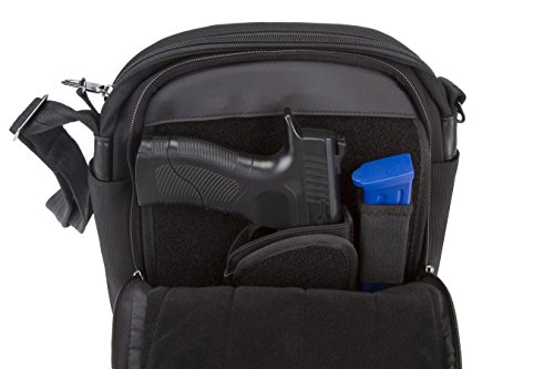 -. Feature : Main compartment with tamper-secure zippers has left-right reversible gun holster / Gun holster secures to rigid back wall of compartment for secure draw / Designated pockets for pepper spray and a knife for layered protection / Front slash pocket and rear zipper compartment / 10x3.5x11