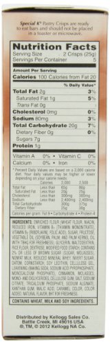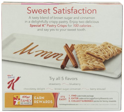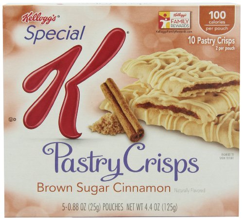 -. Binding : Grocery -. Brand : Special K -. EAN : 0885190520787 -. Feature : 100 calories per serving / Zero grams trans fat / Only 7g of sugar -. Label : Special K -. Manufacturer : Special K -. Model : 3800059547 -. MPN : 567039 -. NumberOfItems : 1 -. PackageQuantity : 1 -. PartNumber : 567039 -. ProductGroup : Grocery -. ProductTypeName : GROCERY -. PublicationDate : 2012-07-10 -. Publisher : Special K -. Size : 0.88 oz -. Studio : Special K -. Title : Kellogg's Special K Pastry Crisps, Brown Sugar Cinnamon, 4.4-Ounce -. UPC : 038000595493