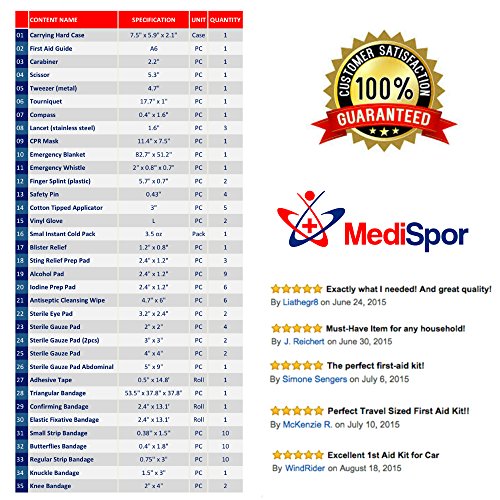 - Feature : ➀ BEST UPDATED KIT AT THIS PRICE LEVEL; It gives peace of mind to know you are well prepared for small accidents with a convenient and COMPREHENSIVE First Aid Kit? We assure you this Kit contains the most unique items (35) at this price level. If you can find a cheaper First Aid Kit on Amazon with more different items, you get our kit for FREE! So Click the "Add to Cart" Now and don't forget to take a look at the Special Offer Codes below! / ➁ SUPER COMPACT DESIGN; forget bulky and heavy first aid kits, the First Aid Kit is a convenient, light weight kit that measures just 7.9 in x 5.9 in x 2.7 in, perfect for storing around the home or carrying on the move! See the full list of high-quality contents in the product picture section. / ➂ CONVENIENT HARD CASE; tired of soft first aid kits that aren't durable? The First Aid Kit is provided in a red hard case with perfectly organized contents to ensure you have easy access to the essential items wherever you are! / ➃ CARABINEER CLIP; make carrying bulky first aid kits a thing of the past when outdoors or playing sport! The First Aid Kit has been designed with a convenient carrying carabineer clip for easy carrying outdoors and on the move! / ➄ FREE FIRST AID GUIDE; ships with a perfectly organized kit with wide range of first aid kit contents, together with a convenient first aid guide containing critical first aid information for easy use and convenient access! Backed by a 100% Satisfaction GUARANTEE!
