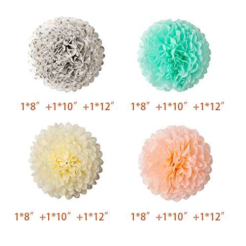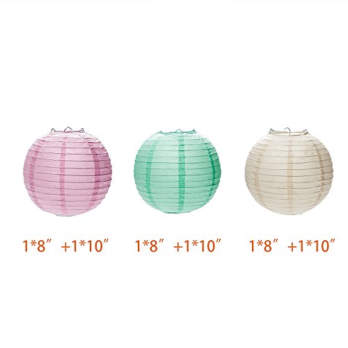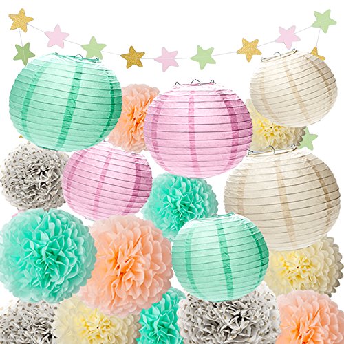 - SIZE & COLOR:Paper lanterns have 2 sizes:3 * 8”, 3 * 10” in 3 colors: mint green, pink and cream. Tissue paper flowers have 3 sizes: 3 * 8”, 3 * 10”, 3 * 12” in 4 colors:mint green, polka dot, peach and cream. 1 strings of stars in 3 colors: gold, pink and green.