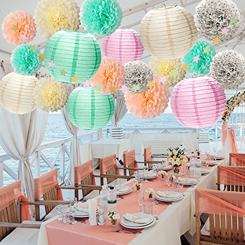 - USING OCCASSION:They are wonderful and versatile for baby shower or wedding or theme party .These lanterns tissue pom poms and stars These decorations can be hung from branches and ceilings, or open against a wall, or set up in doorways or across aisles or anywhere you want to set. They're also fabulous to be used as a photography backdrop!