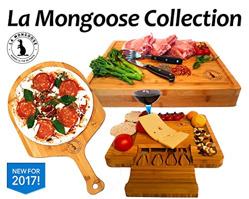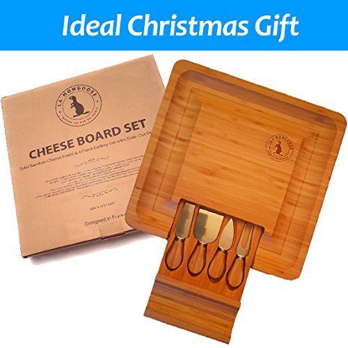 - CHEESE BOARD FEATURES: A 13¼ x 13¼ x 1¾ inch bamboo cutting and serving board, with an ingenious, hidden drawer that pulls out and offers 4 handy cheese tools with bamboo handles and stainless steel blades. These are perfect for slicing, spreading and serving your favorite cheeses. The La Mongoose Cheese Board Set has a large cutting surface and also includes a sizeable groove for presenting your crackers, breads, grapes and chutneys alongside the main attraction.