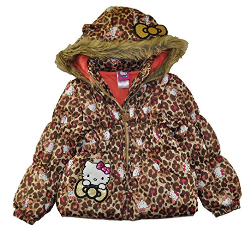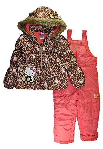 Hello Kitty snowsuit will keep your little girls warm, dry and protected all winter long. The matching puffer jacket is water and wind repellant with a cute, matching print with zipper closure and Hello Kitty embellishment on zipper, faux fur hood trim. Matching solid color snow bib with velcro adjustable shoulder straps, front zip closure with hello Kitty embellishment on zipper , cinched ankles for snow protection, elastic waist and one pocket on right leg. Hello Kitty writing on left leg. partial fleece lining in coat.Feature