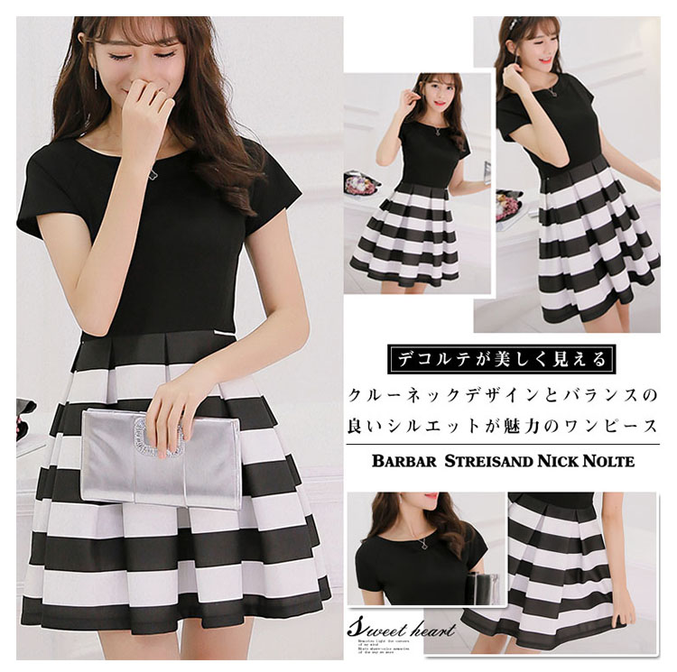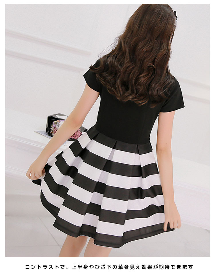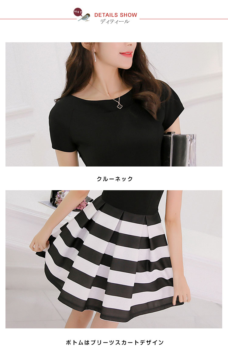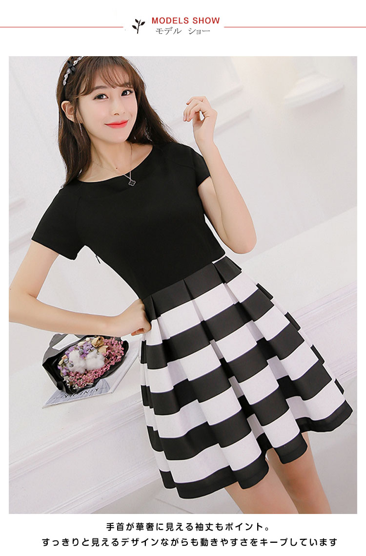 | デコルテが美しく見えるクルーネックデザインとバランスの良いシルエットが魅力のワンピース手首が華奢に見える袖丈もポイント。すっきりと見えるデザインながらも動きやすさをキープしていますトレンドのボリュームスカートのワンピースコントラストで、上半身やひざ下の華奢見え効果が期待できます | |