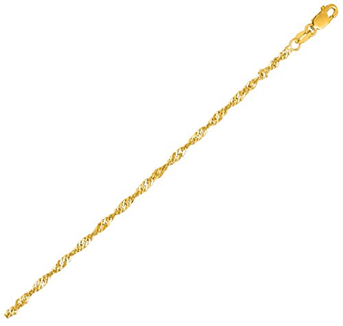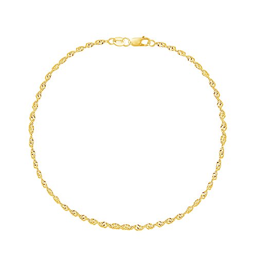 -. Feature : 14K Yellow Gold Singapore Chain Anklet Ankle Bracelet 10" inches 2.1mm / Beautifully crafted and well designed / Size: 10 inches long and about 2.1mm wide; Weighs about 1.8 grams / Lobster lock clasp for comfort and security when worn / PICTURE ENLARGED TO SHOW DETAILS. SEE LISTING DETAILS FOR SIZE.