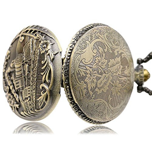 -. Title : Vintage Bronze Locomotive Train Head Men Quartz Engraved Pocket Watch with Chain & Box