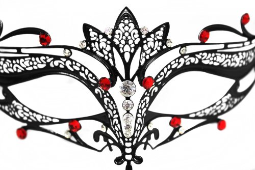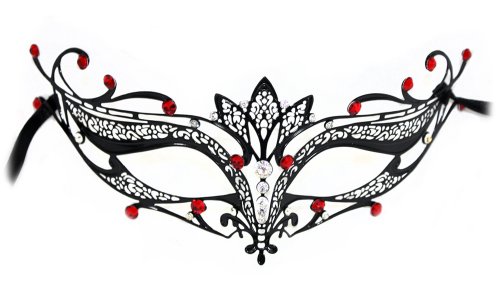 Valentina is Brilliant. The Classic Luxury Black Laser Cut Metal Masquerade Bejeweled mask is adorned with red crystal jewels. The jewels are sprinkled all over the mask like little stars. It secures with ribbon ties.