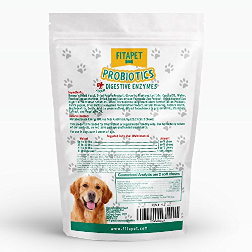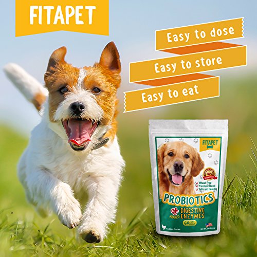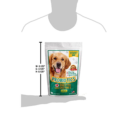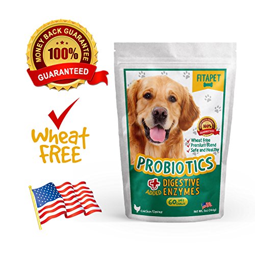 -. Feature : IMPROVES DIGESTIVE HEALTH- good for smelly gas, bad breath and diarrhea; Our Probiotic for Dogs is helpful when dealing with food sensitivity, change of diet, allergies, anxiety, travel or kenneling; Suitable for small to large breed and puppies over 6 weeks / IDEAL FOR PICKY EATERS - looks and tastes like a snack or training aid; No more hiding or grinding tablets or capsules, say goodbye to messy liquid and lumpy powder; No refrigeration shelf stable formula, low calorie moist chewable treat, packaged in re-sealable pouch / OUR PROBIOTIC FOR DOGS IS WHEAT FREE - A Chicken flavor bite-sized chew developed to assist canine gut flora; The probiotic provides support and boosts the healthy bacteria naturally present in the digestive tract / PREBIOTICS ARE ADDED as a source of food for probiotics to grow, multiply and survive in the gut; PLUS ADDED DIGESTIVE ENZYMES aids the breakdown of food and absorption of essential nutrients to help your pets get the most from their meals / 100% PEACE OF MIND MONEY BACK GUARANTEE - We P.R.Ide ourselves on Exceptional Customer Service and we will do our best to assist you and your dog in having a great experience; Our Probiotic Soft Chew Treats with added Digestive Enzymes are so tasty they should be kept out of reach from your pet; Please read all label information on delivery
