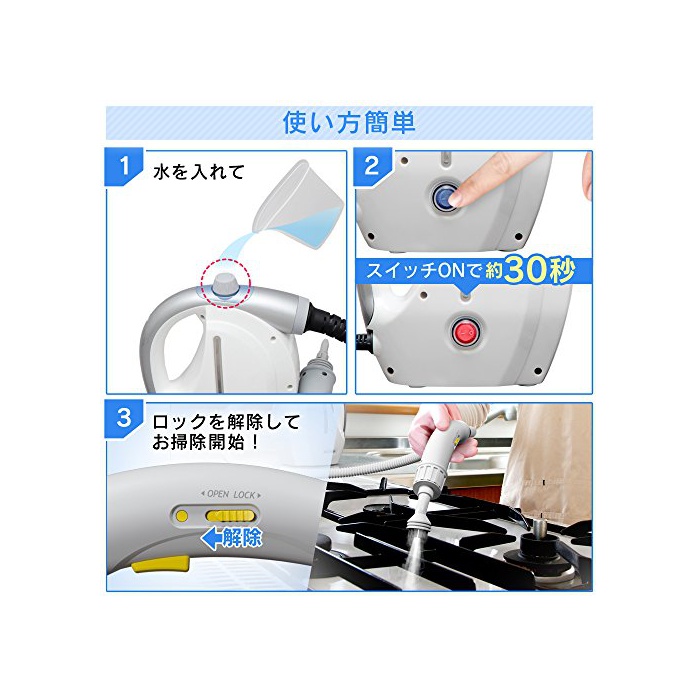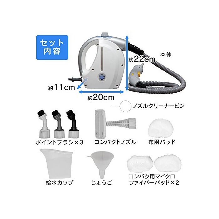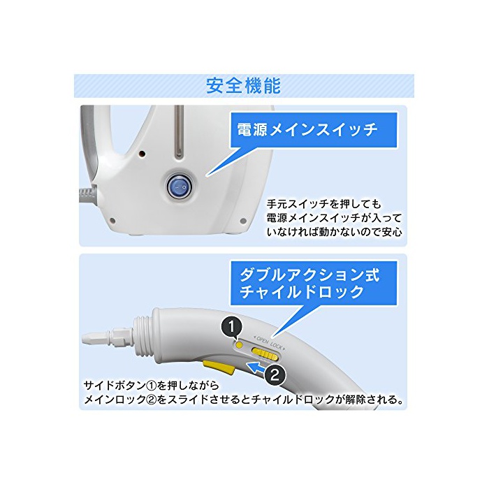 사양 안전 대책:메인 스위치,차일드 록,눈앞 스위치 최대 분사 압력:약1기압 분사 대기 시간:30초 탱크 용량:250ml 연속 사용 시간:약10 분재급수 후의 연속 사용:○ steam 온도:약100℃ 호스 길이:약1.2m 전원 코드 길이:약5m