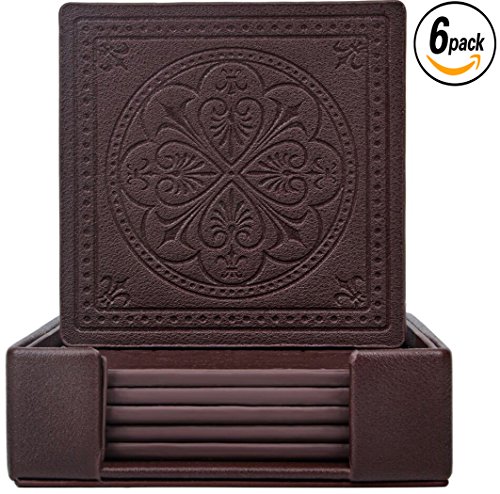 -. Feature : STYLISH SQUARE DESIGN-Set of 6 coasters with holder are both sleek and functional for your modern decor / 3.6" DRINK COASTERS-Suitable for all commercial type of cups, mugs, beer pints, wine glasses or flutes of champagne / ECO-FRIENDLY COASTERS-PU leather material,lightweight,durable,non slip,water resistant / KEEP YOUR FURNITURE SAFE-Protects your dining table,furniture or kitchen countertops from stain or damage / PERFECT GIFT-Excellent gift idea for Housewarming,Birthday,Mother's Day,Valentine's Day