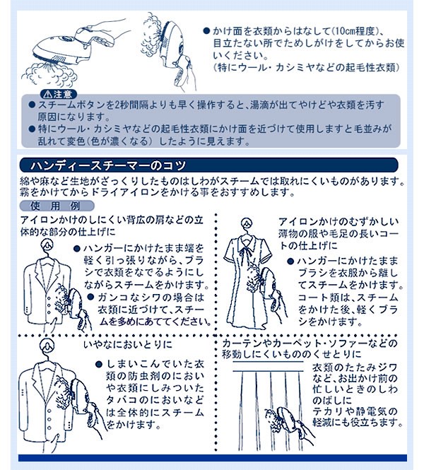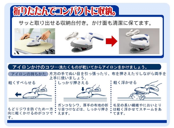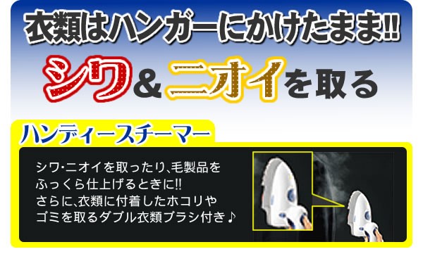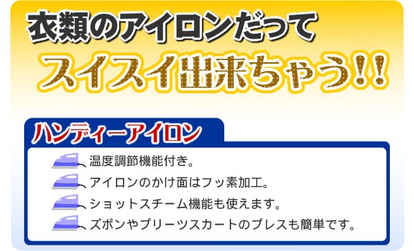 | スチームパワーで衣類快適生活♪スチーム機能で、衣類をハンガーにかけたままシワとニオイを取ることができます。衣類に付着したホコリやゴミを取るダブル衣類ブラシ付き。ハンディーアイロンとしても使えます。温度調節機能付き。アイロンのかけ面はフッ素加工になっています。折りたたんでコンパクトに収納でき便利です。 |