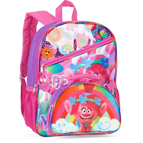 -. Feature : Two-piece full size backpack and detachable lunchbox set for girls / Bright pink and rainbow colors; zipper closures keep items secure / Large main compartment for school books, supplies and accessories / Padded adjustable shoulder straps and mesh side pockets / Trolls Poppy character from the movie, toys and dolls