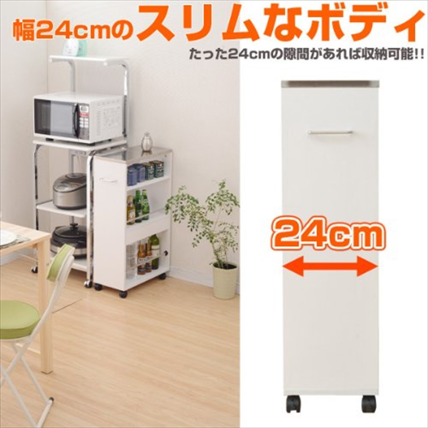 ● Efficient use of gaps in narrow kitchens with a slim width of 24 cm