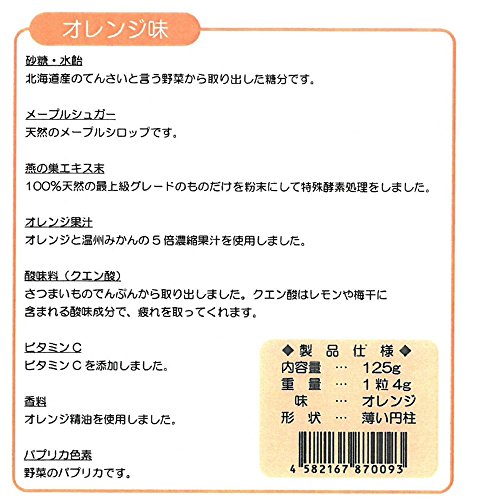 原材料:砂糖、水飴、メープルシュガー、燕の巣エキス末、オレンジ濃縮果汁、酸味料、ビタミンC、香料、パプリカ色素
