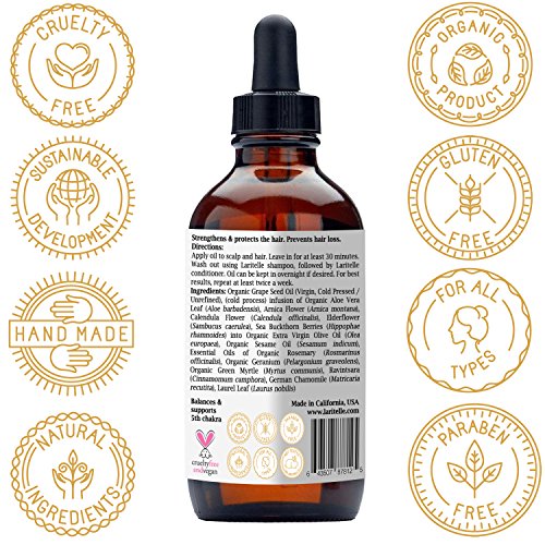 PREVENTS HAIR LOSS & PROMOTES HEALTHY HAIR GROWTH. Rejuvenates hair follicles, heals various scalp conditions. Encourages hair growth by improving circulation. Made with Certified Organic Grape Seed Oil, infused oils of Aloe Vera Leaf, Arnica, Calendula, Elderflower, Sea Buckthorn and best known to prevent hair loss, promote new healthy hair growth and normalize hormonal imbalances of the thyroid essential oils of Rosemary, Geranium, Green Myrtle, Ravintsara, German Chamomile, and Laurel Leaf.