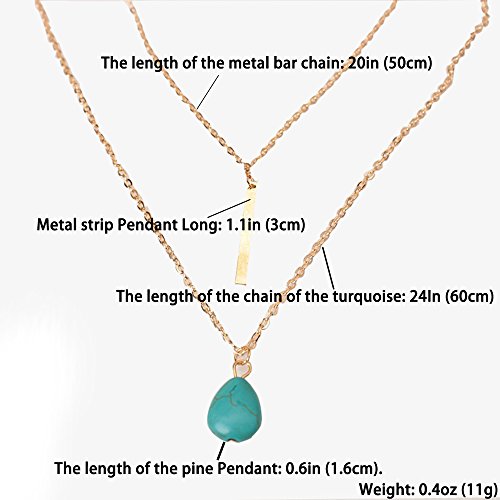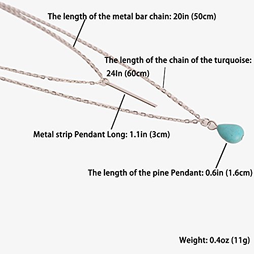 Studio : kaimap Publisher : kaimap Binding : Jewelry Product Description 【Kaimap Brand Story】: Kaimap dedicate to sourcing and selling unique and trendy fashion jewelry and accessory, with the environment friendly material and expert finishing techniques, we have confidence to supply customers the high quality products with fair prices. Each piece Kaimap sell is hand-checked for quality, and we are proud to offer a 100% customer satisfaction guarantee. It's always welcomed to contact us any question any time. 【Kaimap- Your Reliable Choice of Fashion Jewelry】: 1. 100% Brand New and Unique Design 2. All Fashion Jewelry, Well Made and One by One Quality Controlled. 3. Offer Great Values at Affordable Prices, Luxury Appearance. 【Material】: Stainless Steel and Turquoise 【The length of the metal bar chain】: 20in (50cm). 【The length of the chain of the turquoise】: 24In (60cm). 【Metal strip Pendant Long】: 1.1in (3cm). 【The length of the pine Pendant】: 0.6in (1.6cm). 【Weight】: 0.4oz (11g). Method of Jewelry Maintenance and Protection 1. Please don't wear a long time. You should often replace your jewelry and avoid wearing a long time, especially in the hot summer. 2. Please do not touch with chemicals; otherwise, it will erode your jewelry. 3. Please try not to touch water and don't wear it when you bathing and swimming. Otherwise, these are all damaged to your jewelry, and will affect its gloss. 4.Frequent cleaning is necessary. Please use a soft brush to wipe the surface of the accessory and remove its surface stains. 0