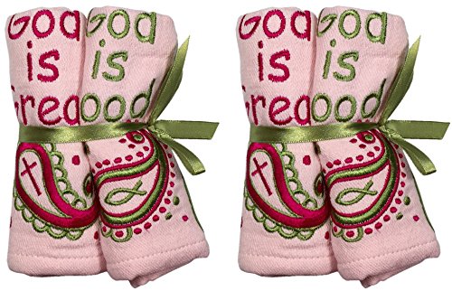 -. Binding : Apparel -. Brand : Manual Woodworkers -. Color : Pink, Green -. Department : baby-girls -. EAN : 0808805915013 -. Feature : Each Pink cotton cloth is trimmed with pink and green rick rack and features embroidered text / Start her signature style from the get-go with Izzy's Gifts of Grace Baby Collection / Manual Woodworkers and Weavers has been providing the finest decor, linens, and accessories for home and family / Cotton burp cloth that combines style and function to create a gift that will be used and appreciated / Set of 4 burb cloths, measuring 16 x 13 inches each -. Label : Manual Woodworkers & Weavers -. Manufacturer : Manual Woodworkers & Weavers -. MPN : 4327885817 -. PackageQuantity : 2 -. PartNumber : 4327885817 -. ProductGroup : Apparel -. ProductTypeName : ACCESSORY -. Publisher : Manual Woodworkers & Weavers -. Size : 16 x 13" -. Studio : Manual Woodworkers & Weavers -. Title : Manual God Is Great God is Good Girls Burp Cloths, Pink, 13 X 16" - 2 Sets of 2 -. UPC : 808805915013