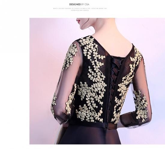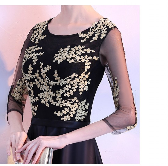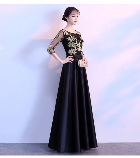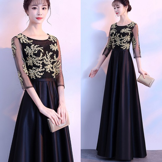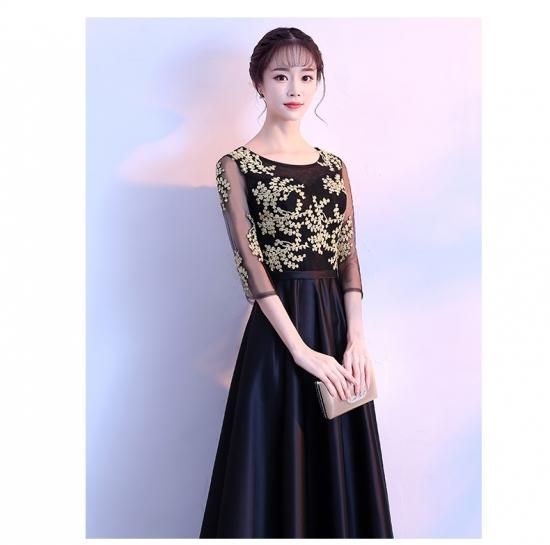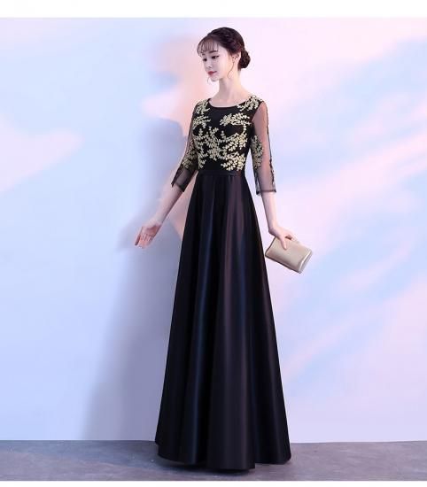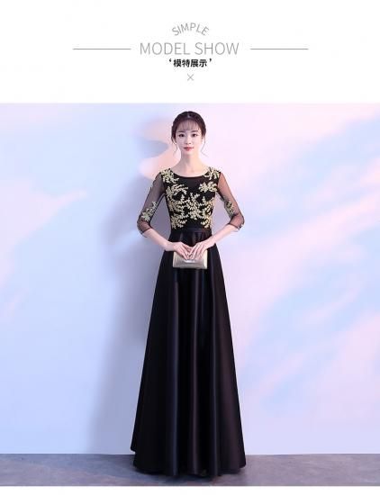 ゴールドの刺繍がゴージャスな、ロング丈パーティードレス。