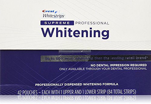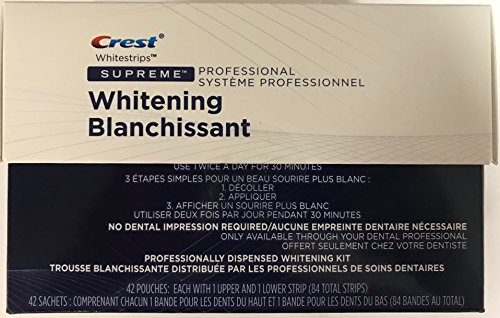 Crest Whitestrips Supreme has 100mg of gel with 14% hydrogen peroxide = 14mg of hydrogen peroxide per upper strip. Crest Whitestrips Professional has 200mg of gel with 6.5% hydrogen peroxide per upper strip. Crest Whitestrips Supreme is the most effective of the Crest Whitening Strips.Feature