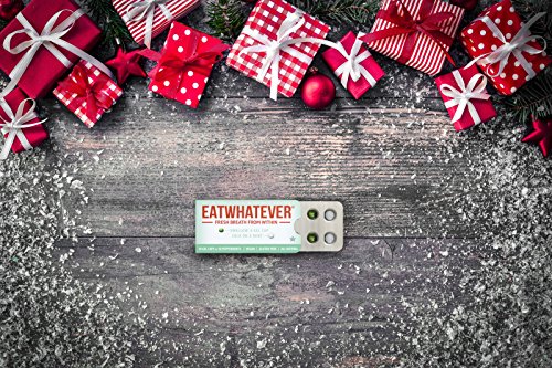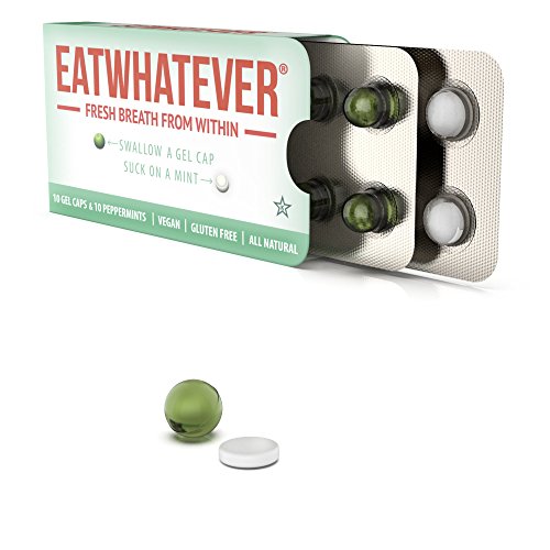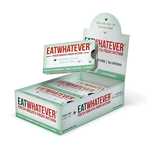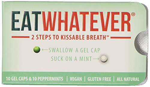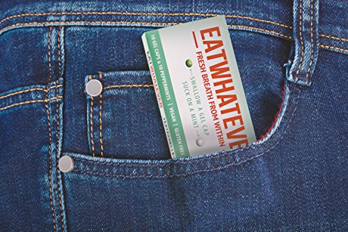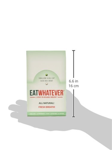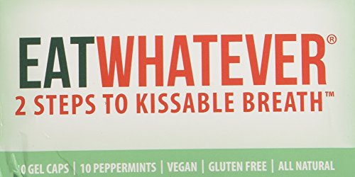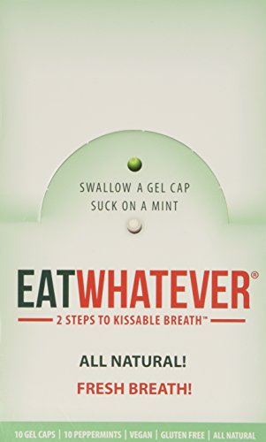 ReleaseDate : 2014-07-23 Studio : Eatwhatever Publisher : Eatwhatever Binding : Grocery Product Description Eatwhatever is a revolutionary breath freshener, assuring confident kissable breath in two quick steps- swallow a gel, suck on a mint. Unlike other breath fresheners, Eatwhatever works in your stomach AND your mouth. Eatwhatever is all natural, vegan, gluten free and filled with organic oils. Now available in 2 flavors - Peppermint and Ginger. 0