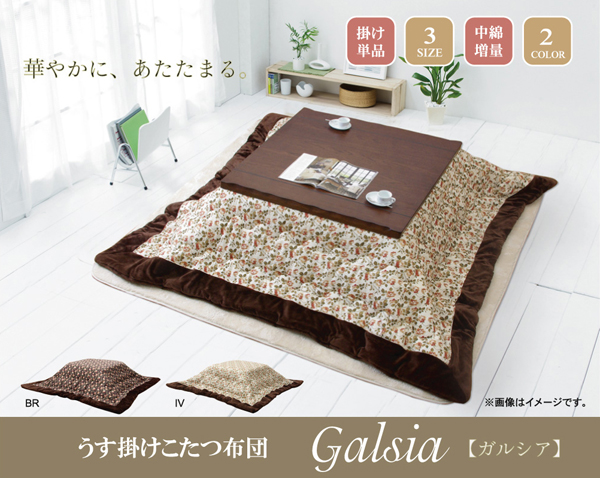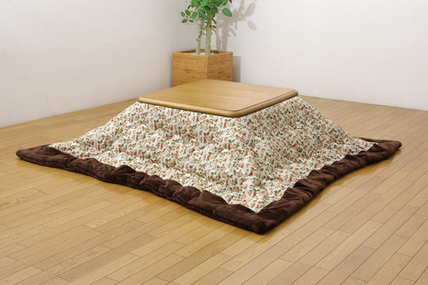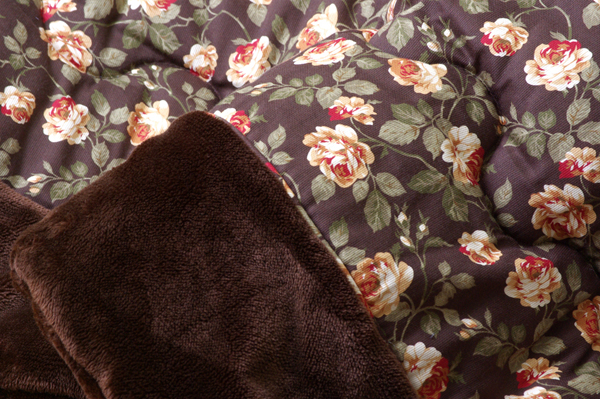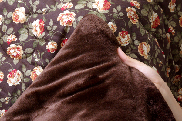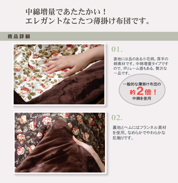 エレガントな小花柄の綿素材を使用したこたつ布団です。表地は綿100%です。綿はポリエステル素材よりも静電気がおきにくく、繊維の中でも特に肌触りがよいのが特徴です。裏地には肌触りの良いフランネルを使用しています。薄手なのでかさばらず、コンパクトに収納できます。部分暖房のこたつ布団は電気代もお得です。