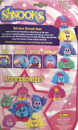 -. Binding : Toy -. Brand : Shnooks -. EAN : 0845218001049 -. Feature : Shnooks are the brightly colored soft creatures with outrageous fluffy hair! / Magically Grows 8X: Shnooks come in its own flat vacuum pack - to release all you have to do is rip open then shake your shnook awake and watch its hair magically grow 8 times its original size! / Each shnook comes with a brush and accessories allowing you to create a variety of different hairstyles. / They can also hook up with each other - use the clip included to attach your shnooks and build a friendship chain! / With 6 shnooks available each with a different look and name why not collect them all! -. IsAdultProduct : 0 -. Label : Zuru -. Manufacturer : Zuru -. Model : Woogie -. MPN : Woogie -. PackageQuantity : 1 -. PartNumber : Woogie -. ProductGroup : Toy -. ProductTypeName : TOYS_AND_GAMES -. Publisher : Zuru -. SKU : D240FF1C -. Studio : Zuru -. Title : Shnooks Plush Friend Toy, "Woogie" Purple & Teal, with Hair Accessories -. UPC : 845218001049