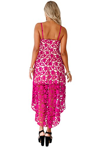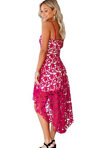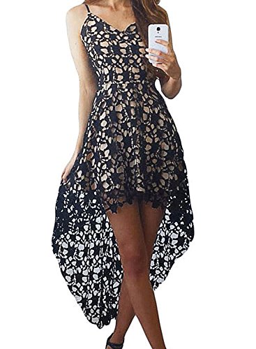 The dress is made from lace covering with nude illusion lining, adjustable spaghetti straps, sexy v neck, concealed back zipper and trendy hi-low hemline finished.