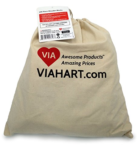 -. Binding : Toy -. Brand : VIAHART -. Feature : NEW! We listened to our customers and have changed the packaging to a beautiful reusable canvas bag! | Contains 100 wooden blocks | Blocks are made from Pine / Pieces range in size from 1" to 3" | Except for ladder piece which is 7" long / Cultivates Visual and Spatial Reasoning! | Timeless Classic Children's Toy / Product Measures 11 x 8 x 4 in inches | 28 x 20.4 x 10.2 in centimeters | Product Weighs Approximately 0 lbs / 0 kgs | These dimensions and weight do not include the packaging -. Label : VIAHART -. Manufacturer : VIAHART -. ProductGroup : Toy -. ProductTypeName : TOYS_AND_GAMES -. Publisher : VIAHART -. Studio : VIAHART -. Title : VIAHART 100 Piece Wooden Block Construction Building Set
