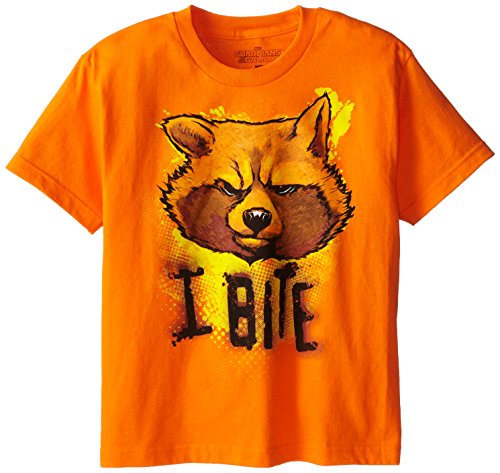 -. Binding : Apparel -. Brand : Marvel -. Color : Orange -. Department : boys -. Feature : Silk screen guardians of the galaxy tee / Guardians of the galaxy front print short sleeve tee -. Label : Mad Engine Boys 8-20 -. Manufacturer : Mad Engine Boys 8-20 -. Model : E1458YS -. PackageQuantity : 1 -. ProductGroup : Apparel -. ProductTypeName : SHIRT -. Publisher : Mad Engine Boys 8-20 -. Studio : Mad Engine Boys 8-20 -. Title : Marvel Boys' Guardians of the Galaxy I Bite T-Shirt
