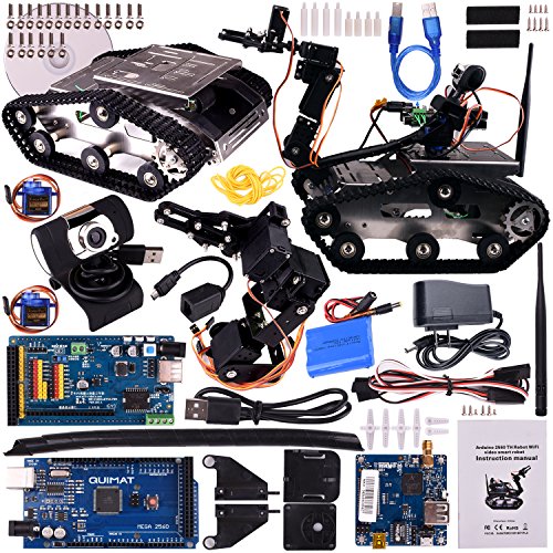 Quimat robot car kit is programmed well in default,just assemble together,and then start playing! Features: 1).Designed with 4-DOF manipulator and 2-DOF robot pan-tilt platform,enjoy much of the freedom of the control angle. 2).5DBi External WiFi Antenna gain high signal intensity and long transmission distance,more fast and steady,brings you real time 3).Multi Speed Control System for you to control the speed of the robot. 4).Built-in 2200mAh battery pack with 12V/8A protection circuit,provide continuous power for robot for a longer endurance. 5).Adopt high quality 12V 350rev/min powerful motor,the maximum load is up to 8 Kg,which support continuous power for robot. 6).New HD camera with manual adjustment of focus, and maximum resolution of dynamic video can be up to 640*480P. Please note that the graphical programming interface may include some Chinese notes whcih will not affect the code running, if you have any questions about it, just feel free to contact us. Package Content: 1.Arduino Compatible MEGA2560 R3 Robot Drive motherboard *1 2.WIFI Robots PWR.AR power supply and motor driver shell board *1 3.Robot-link wifi wireless video and data transfer module *1 4.Robot Link 300M 5DB Antenna *1 5.4 Degree of freedom manipulator *1 6.Manipulator Steering gear extension line *3 7.9G Steering Engine *2 8.Metal track Chassis *1 9.720P USB Camera *1 10.2200mAh 12V 8A battery *1 11.12V Charger *1 12.Nylon column *8 13.15cm Wire(electric motor use) *4 14.Micro USB Cable *1 15.Without cap screw M3 *20 16.Screw Cap M3 *20 17.MINI USB transfer Network port Cable *1 18.Velcro *1 19.For arduino board Download cable *1 20.Tow degrees of freedom video PTZ (including screw bag) *1 21.Beam tube *1 22.Driver DVD *1 23.Instruction manual *1Feature