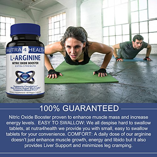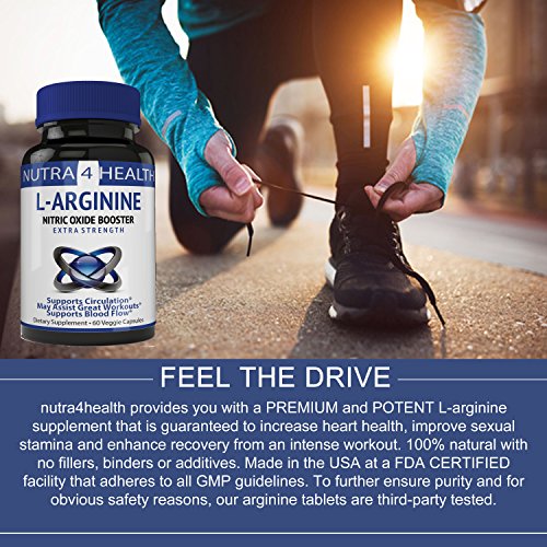 FEEL THE DRIVE: nutra4health provides you with a PREMIUM and POTENT L-arginine supplement that is guaranteed to increase heart health, improve sexual stamina and enhance recovery from an intense workout. 100% natural with no fillers, binders or additives. Made in the USA at a FDA CERTIFIED facility that adheres to all GMP guidelines. To further ensure purity and for obvious safety reasons, our arginine tablets are third-party tested.