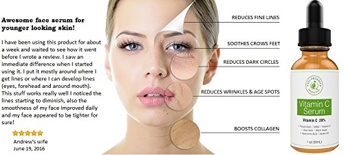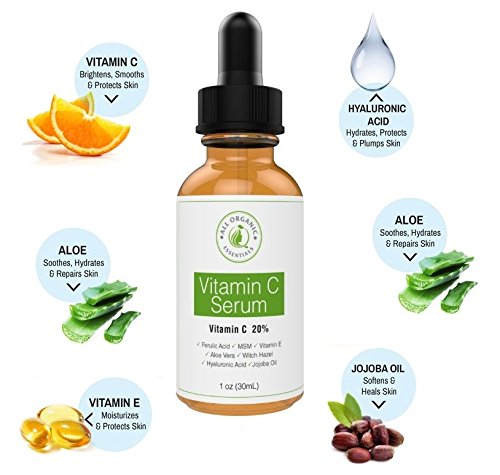 All Organic Essentials Vitamin C Serum 20% is a powerful antioxidant product. This is the best topical Serum on the market. It is also the most effective face serum. The vitamin c benefits include reduction in sunburned cell up to 96% and it prevents the formation of free radicals in sun exposed skin. This face serum helps to fade age spots, sun spots and skin discoloration. It refines your skin texture and reduces the appearance of wrinkles as well as minimizes existing wrinkles which makes your skin appear years younger and more vibrant beautiful skin.