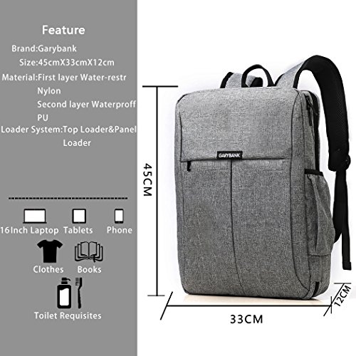 Application: Multipurpose Daypacks is perfect for business trips or weekend getaways or for simply heading to the office or school and home again. Package includes: 1 x Garybank Business Laptop Backpack Note: 1.DO NOT wash it with hot water and alkaline detergent. 2.Water repellent in 5-10 minutes, clean water in 5 minute will not left any mark , If you let water/rain on it too long time, it will absorb into it. Do not use it in heavy rain.