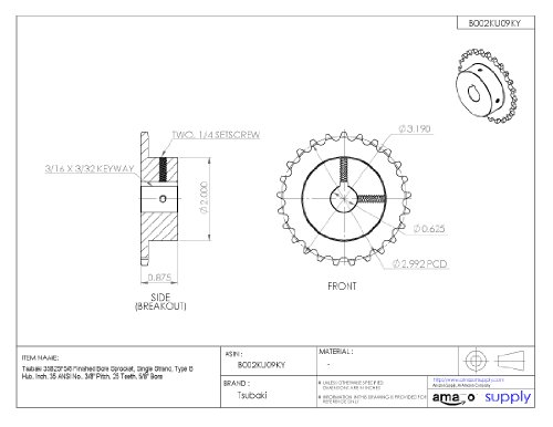 Tsubaki 35B25FJ Finished Bore Sprocket, Single Strand, Inch, #35 ANSI No., 3/8" Pitch, 25 Teeth, 5/8" Bore