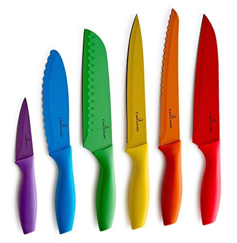 - 6-piece knives set with 6 Blade Guards, each knife carries a specific prep. task: Paring, Utility, Carving and Slicing, Bread Knife, Chef Knife, Santoku