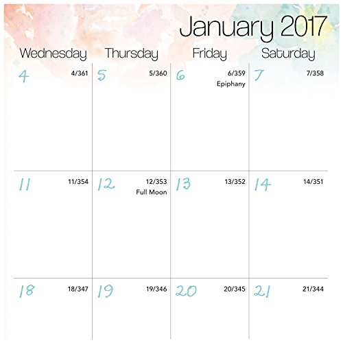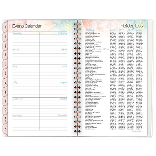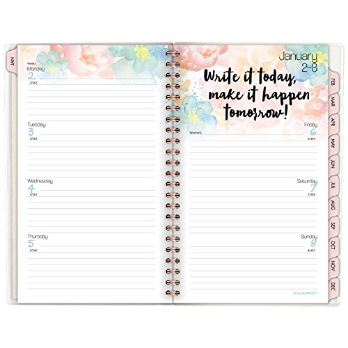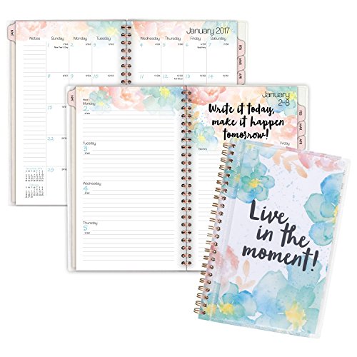 -. Binding : Office Product -. Brand : At-A-Glance -. EAN : 0038576363878 -. Feature : B-Positive planner front cover features the message "Live in the moment! in. on a backdrop of watercolor florals. Clear cover pocket allows personalization. Insert a custom cover page or use to store loose sheets. / Planner covers 12 months from January - December with Julian dates for a full year of weekly and monthly planning, with special reference pages included / One week per two page spread with an equal amount of ruled planning space for each day Monday - Sunday to record daily plans and tasks. Right hand page of the weekly spread features another positive message to encourage productivity. -. Label : ACCO Brands -. Manufacturer : ACCO Brands -. Model : 187-201 -. MPN : 187-201 -. NumberOfItems : 1 -. PackageQuantity : 1 -. PartNumber : 187-201 -. ProductGroup : Office Product -. ProductTypeName : OFFICE_PRODUCTS -. Publisher : ACCO Brands -. Size : 5 3/8 x 8 1/8 -. Studio : ACCO Brands -. Title : AT-A-GLANCE Weekly / Monthly Planner / Appointment Book 2017, Customizable, 4-7/8 x 8", B-Positive (187-201) -. UPC : 038576363878